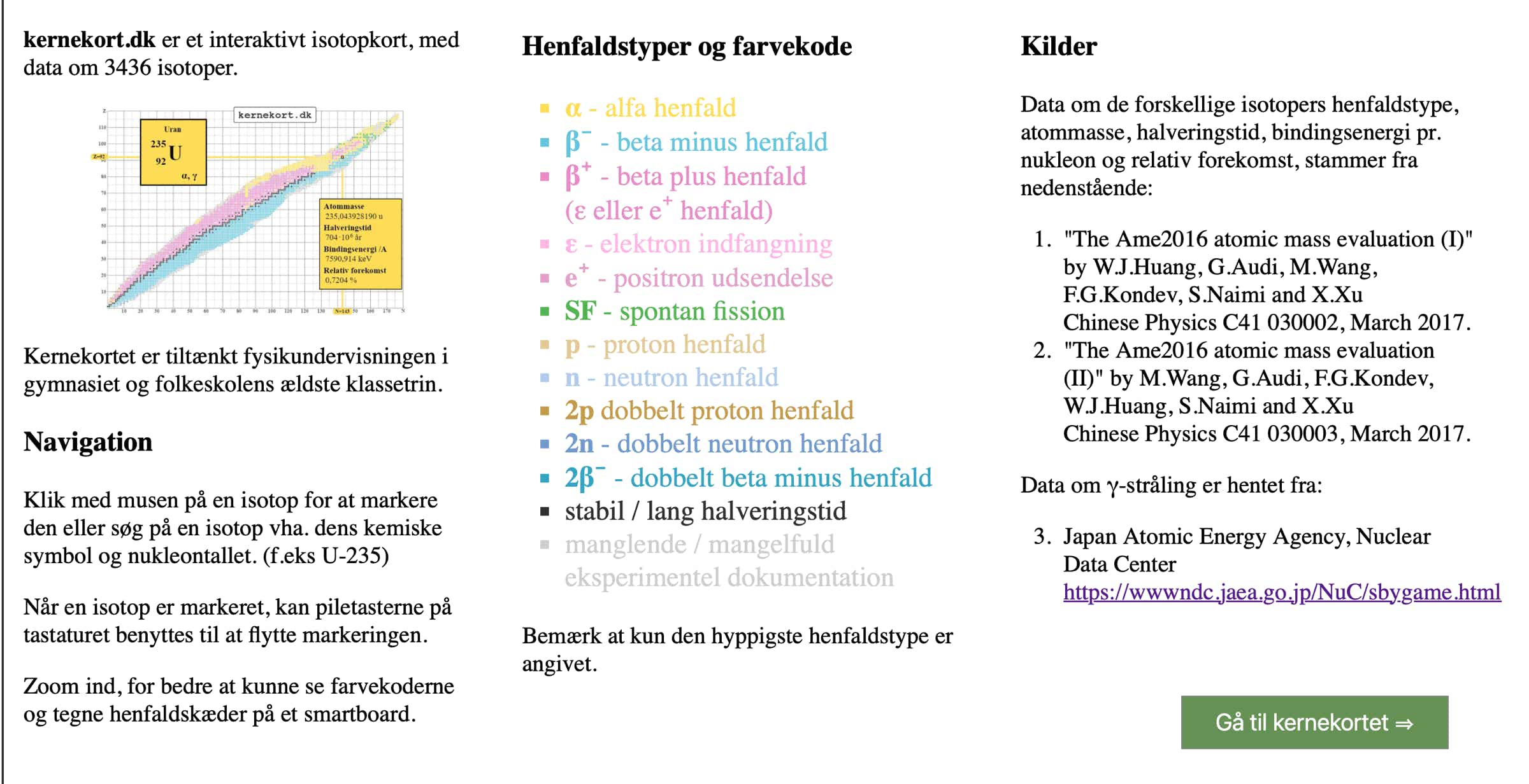 Du kan også se de forskellige isotoper på ptable.com husk at klikke på fanebladet for isotoper. Der findes også en app til din tablet eller telefon med et interaktiv nuklidkort (Isotope Browser).